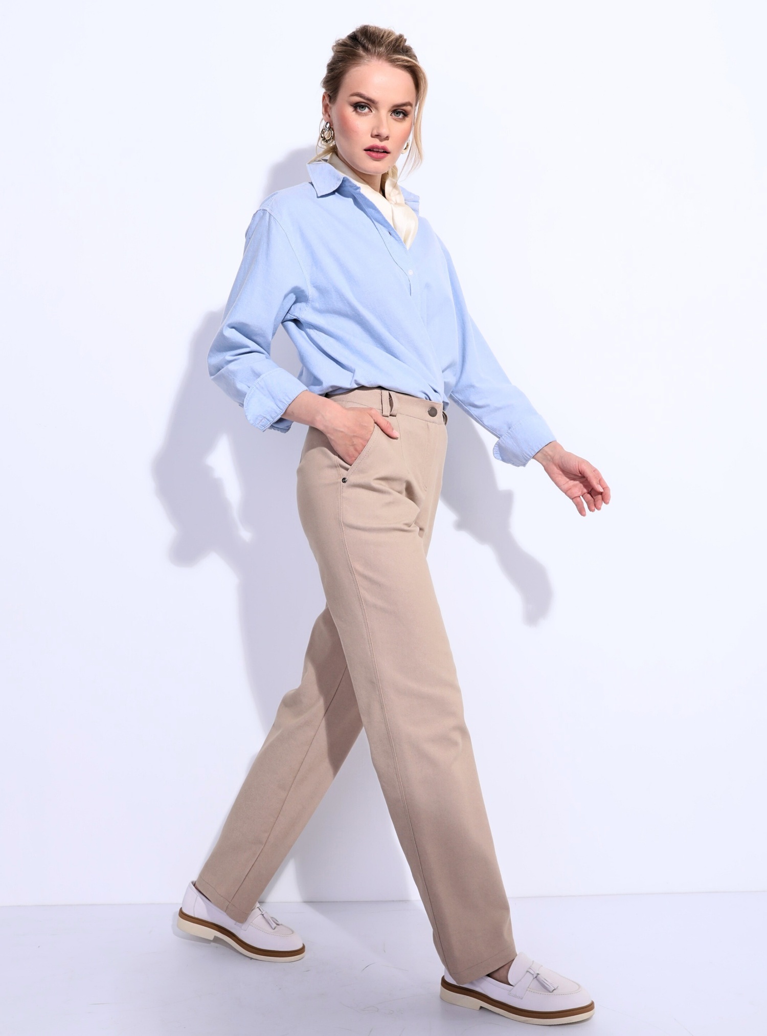 Находкой для современных модниц являются летние брюки. Лаконичный дизайн и простота деталей позволяют создавать с ними разные яркие современные образы. Для девушек и женщин разных возрастных категорий высокая посадка светлых брюк очень удобна и практична. Прямой крой скрывает несовершенства фигуры, визуально вытягивает силуэт, одновременно корректируя его. Карманы с отрезным бочком и двойные шлевки на поясе являются не только стильными акцентами, но и весьма функциональными преимуществами модели.