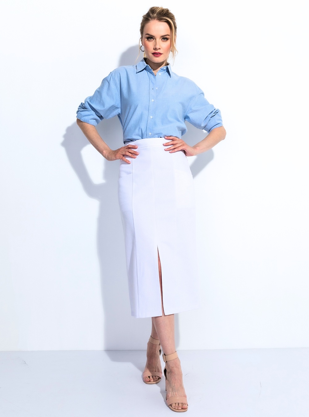 Джинсовая юбка имеет оригинальный и необычный крой, состоящий из 8 клиньев и 2-х очаровательных разрезов спереди и сзади не оставит равнодушной и молодую девушку, и искушенную в моде женщину. Высокая посадка юбки длинной всегда популярна и любима многими, подойдет, как высоким, так и невысоким представительницам прекрасного пола. Накладные карманы в юбке с разрезом, расположенные между клиньями, делают образ женственным и утонченным. Прямой силуэт подходит большинству типов фигур и отлично смотрится в повседневности, также легко может трансформироваться в стильный вечерний образ.